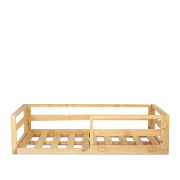 Cama baranda horizontal de madera cepillado, lijada, suave al tacto con bordes redondeados. No incluye instalación, envío, colchón ni un otro elemento complementario que aparece en la imagen.
