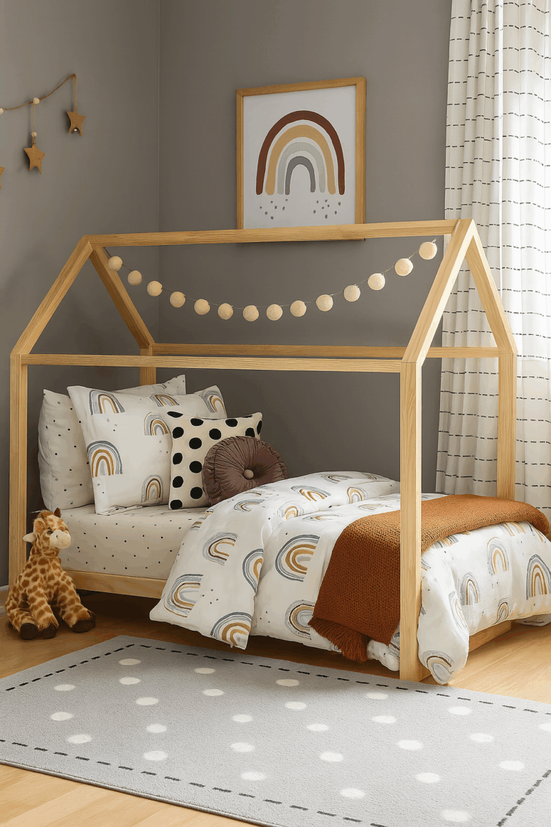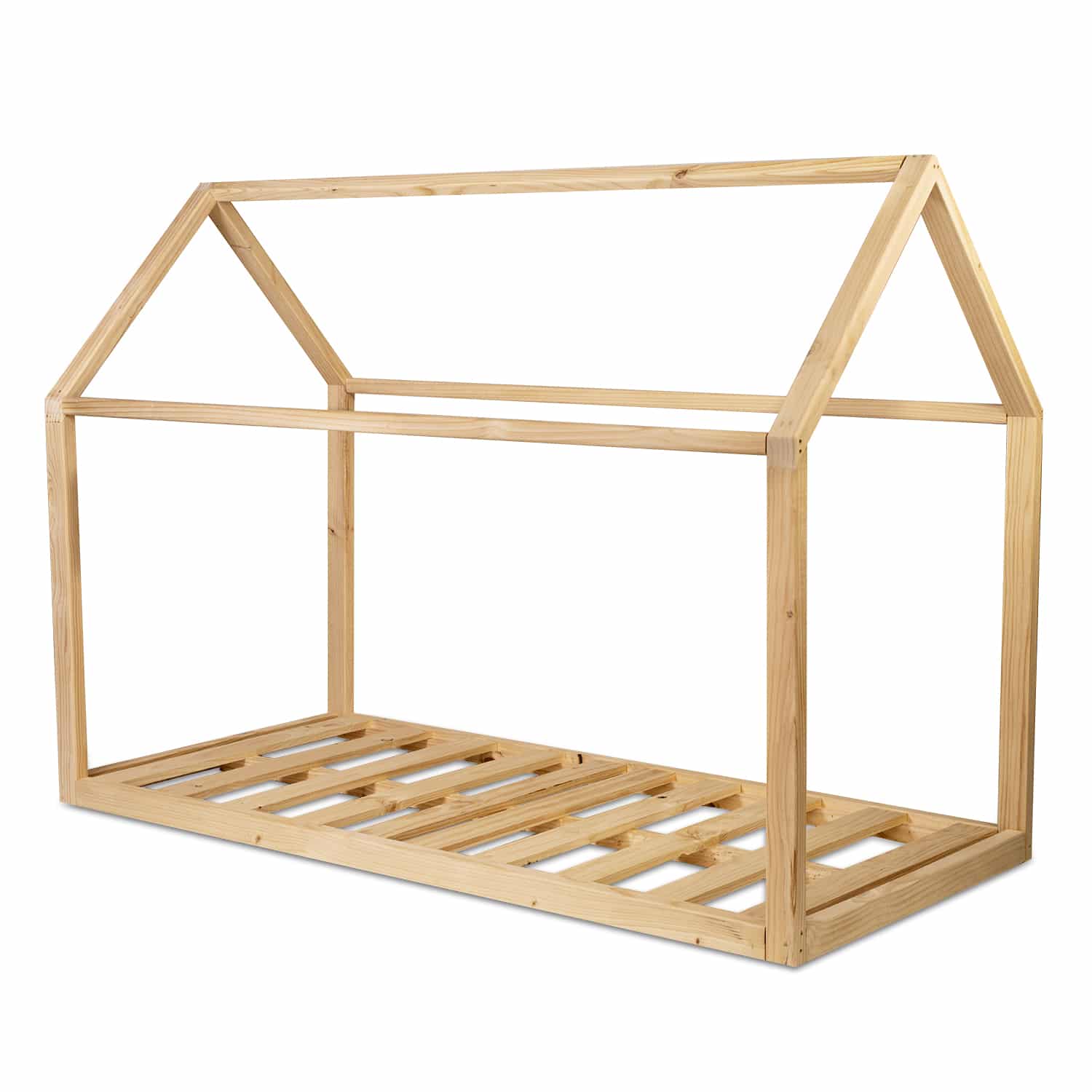 La cama casita sin baranda es de madera cepillado, lijada, suave al tacto con bordes redondeados. No incluye ni un otro elemento complementario que aparece en la imagen.