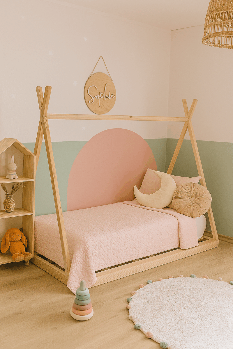 Cama tipi sin baranda de madera cepillado, lijada, suave al tacto con bordes redondeados. No incluye ni un otro elemento complementario que aparece en la imagen.