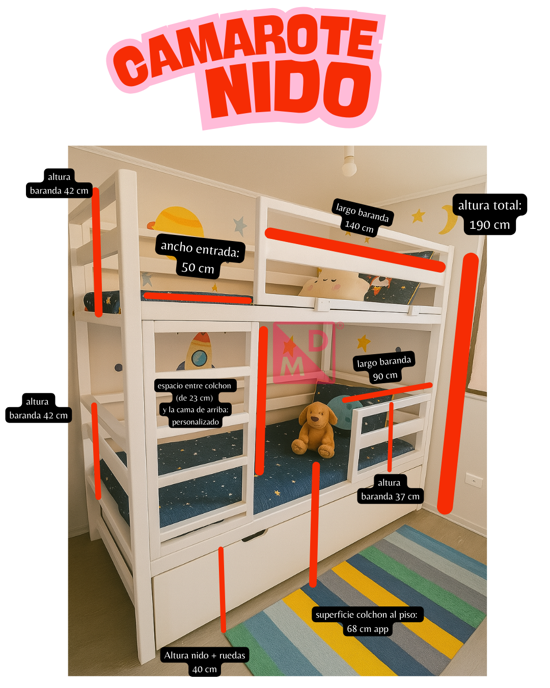 Espacio para colchón inferior de hasta 23 cm (resorte). El nido aumenta el camarote en 50 cm aproximadamente. Hablar internamente si desea personalizar esta altura.